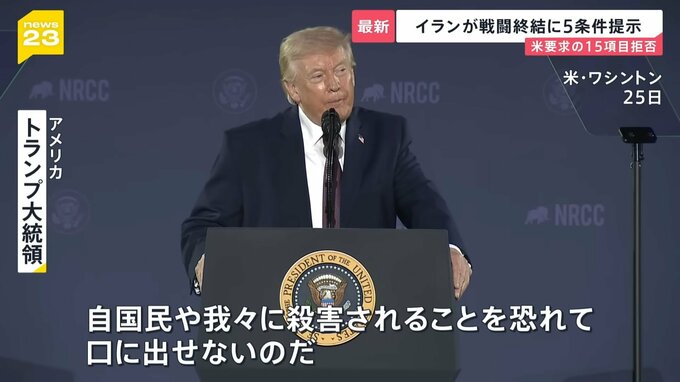 イランの国営メディアは、安全保障担当の高官が、“イランはアメリカが提示した条件を拒否する姿勢を示した”とし、「トランプ大統領に戦争終結の時期を決めさせることは許さない」と明らかにしたと報じました。