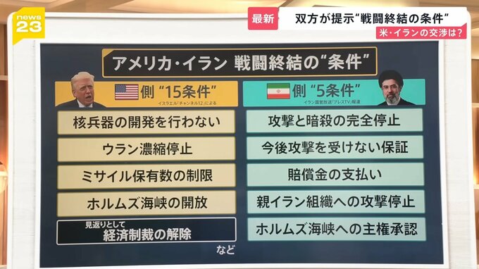 戦闘終結に向かって交渉は進むのでしょうか。アメリカ、イラン双方がそれぞれ要求などを含めて条件を出しました。
