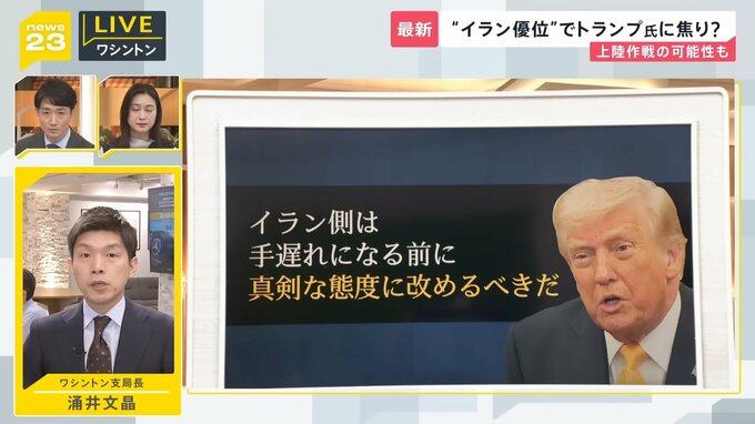 ただ、焦りも見え隠れしていまして、現地時間の朝6時半過ぎに、「イラン側は手遅れになる前に真剣な態度に改めるべきだ」とSNSに投稿し、警告しました。