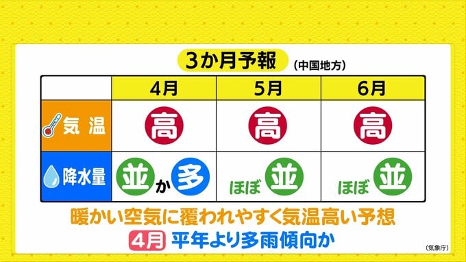 気象庁が発表している最新3か月予報によりますと、4月~6月にかけて気温は平年より高い傾向が続く見込みです。降水量に関しては、4月は平年並から平年より多くなる可能性があります。