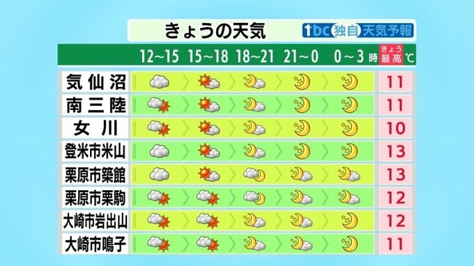 ■登米市米山:13℃ ■栗原市築館:13℃ ■栗原市栗駒:12℃
