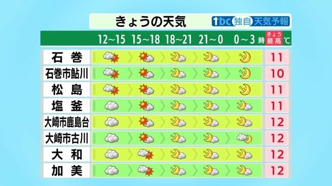 ■塩釜:11℃ ■大崎市鹿島台:12℃ ■大崎市古川:12℃