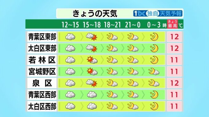 ■太白区東部:12℃ ■太白区西部:11℃ ■宮城野区:11℃