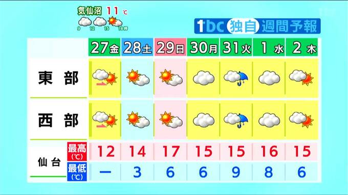 来週月曜日以降は前線や湿った空気の影響で雲が広がりやすくなり、火曜日は低気圧の接近によりやや長い時間にわたって雨が降るおそれがあります。楽天イーグルスのホーム開幕戦への影響が心配されます。また来週も気温は平年より高い日が多く、仙台の桜が3月中に開花する可能性も出てきています。