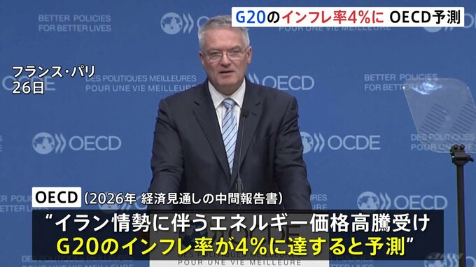 OECD=経済協力開発機構は26日、2026年の経済見通しを発表し、イラン情勢に伴うエネルギー価格の高騰を受け、G20のインフレ率が4%に達すると予測しています。前回25年12月予測から1.2ポイントの大幅な上方修正とな…