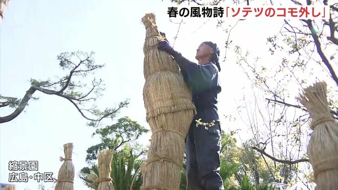 広島市の縮景園で27日、春の風物詩「ソテツのコモ外し」が行われました。