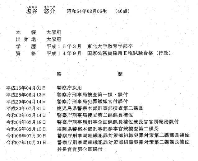 塩谷氏は大阪府出身で、東北大学教育学部在学中に国家公務員採用II種試験に合格し、2003年に警察庁に入庁。これまで、鹿児島県警の捜査第二課長や福岡県警刑事部の参事官、警察庁の組織犯罪対策第二課長補佐などを歴任してきました。