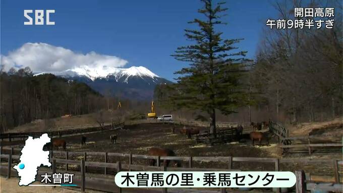 雪をいただいた御嶽山を望む開田高原「木曽馬の里・乗馬センター」。木曽馬の飼育や繁殖に取り組み現在、42頭を育てています。ひときわ小さな子馬は、3月13日に生まれたばかりですが、元気いっぱいに牧場を走り回ります。