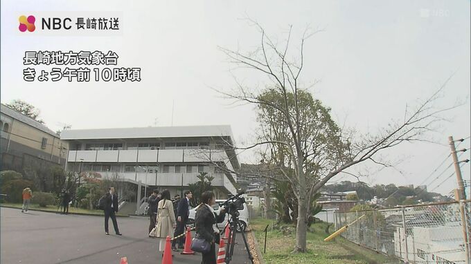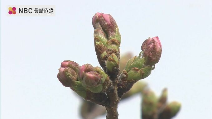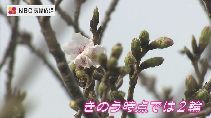長崎地方気象台では27日午前、ソメイヨシノの花が3輪開いているのが確認され、開花発表の基準となる5~6輪まであと一歩となっています。