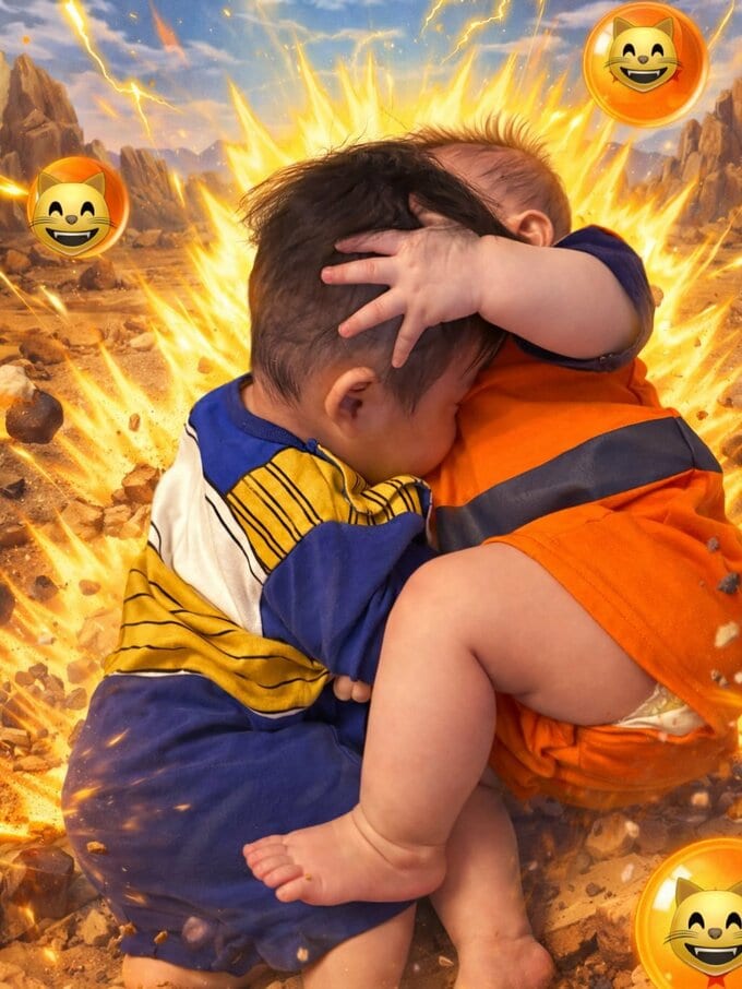 「いつか、悟天とトランクスみたいなやんちゃに仲良しな双子になったらかわいいなあ!!」という翔子さんは、双子がじゃれ合う様子にAI生成したと思われる爆裂な背景を合成してノリノリ。悟空のロンパースを着たお兄ちゃんが武舞台でずり這う様子も投稿していて、二人の前途に夢を馳せています。