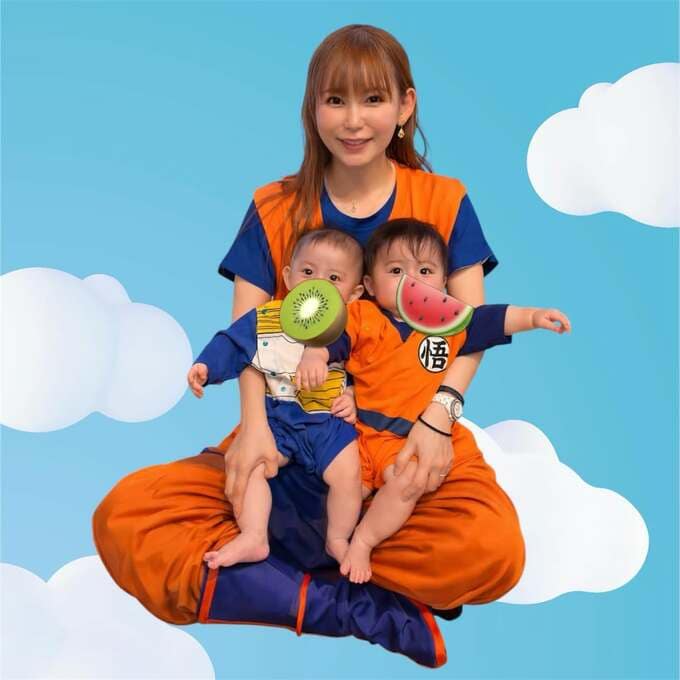 翔子さんは「しまむらバースデイのドラゴンボール服、とどいた!!」と、大喜びの様子で投稿。「双子男子に着せられて最高!!かわいいいいい」と自分自身も悟空のコスチュームを着て、双子を抱きかかえています。