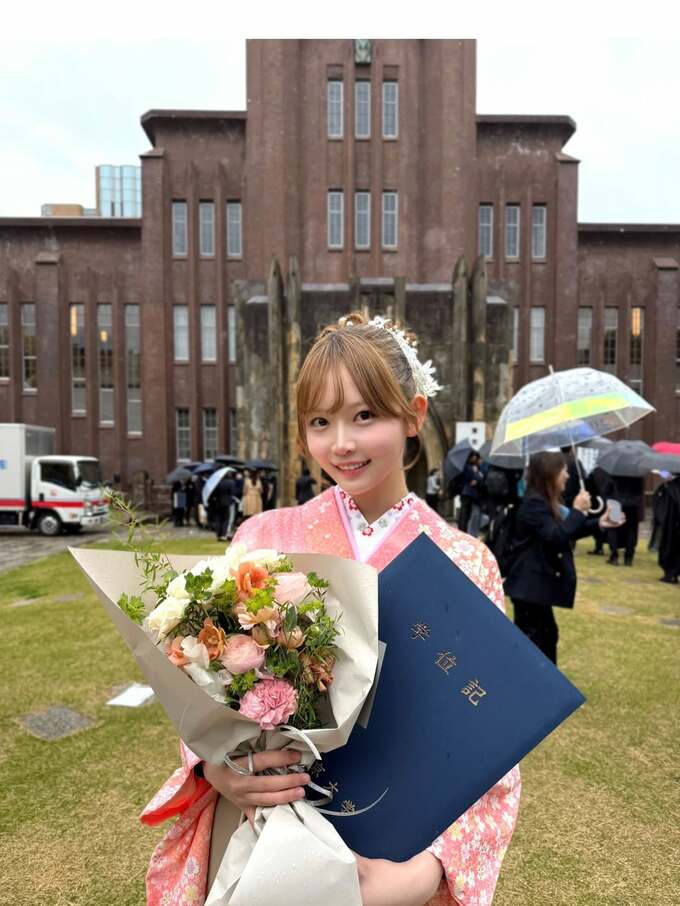 田中さんは「東京大学を卒業しました」と綴り、東大の本郷キャンパスの安田講堂を背景に、ピンク色の袴姿で、卒業証書を手にした画像を投稿。