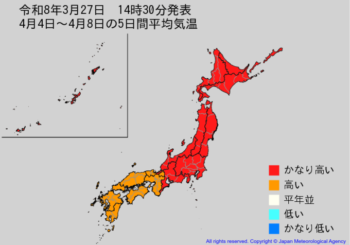 【2週間気温予報】北・東日本の向こう2週間の気温は高く、かなり高い日が多い予報 農作物の管理などに注意 全国の天気を画像で 気象庁 テレビユー山形 2026年3月27日(金) 16:58 国内 ■4月4日~4月8日の5日間平均気温(画像) ・8日先から12日先まで5日間平均した日平均気温を表示しています。 ・かなり高い(かなり低い)は、かなり高い(かなり低い)気温となる確率が30%以上のときに表示します。