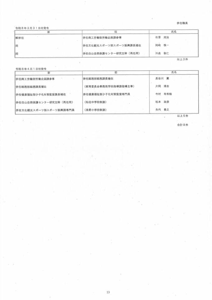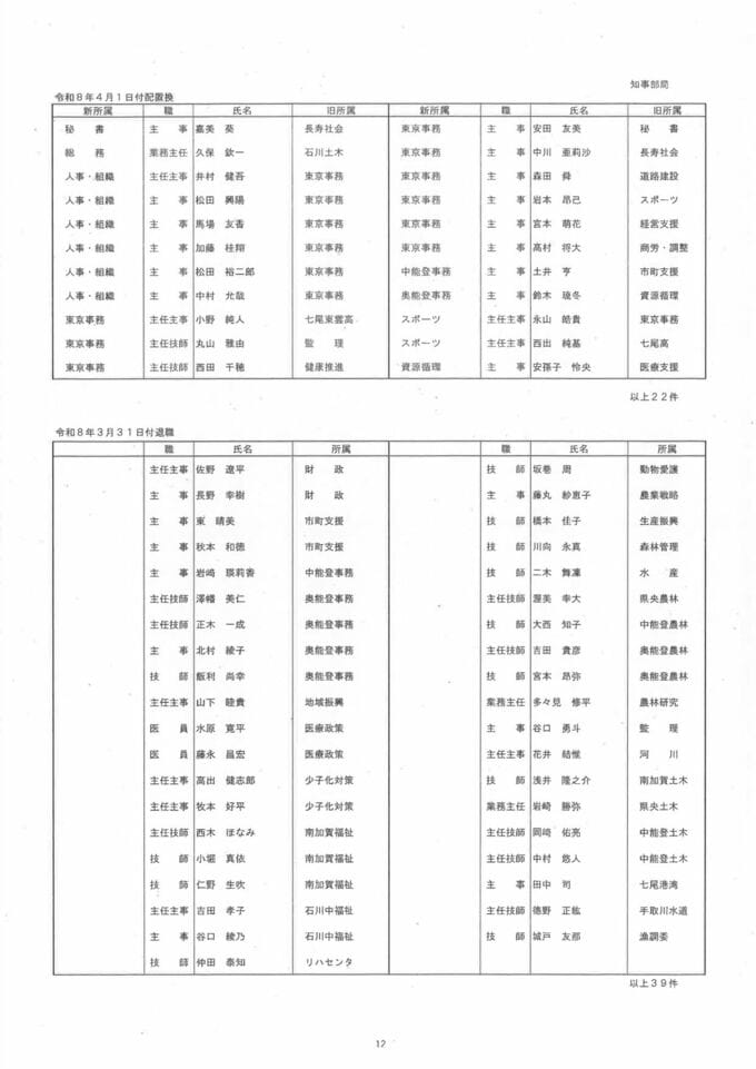 「知事室長と危機管理部長は留任」石川県職員人事異動2026・令和8年4月1日付け「年度末任用期間で留任」「役職定年の特例任用」等対象分 北陸放送 2026年3月27日(金) 17:44 国内 【配置換え】【退職】【解併任】【発令】 石川県発表より 石川県発表より