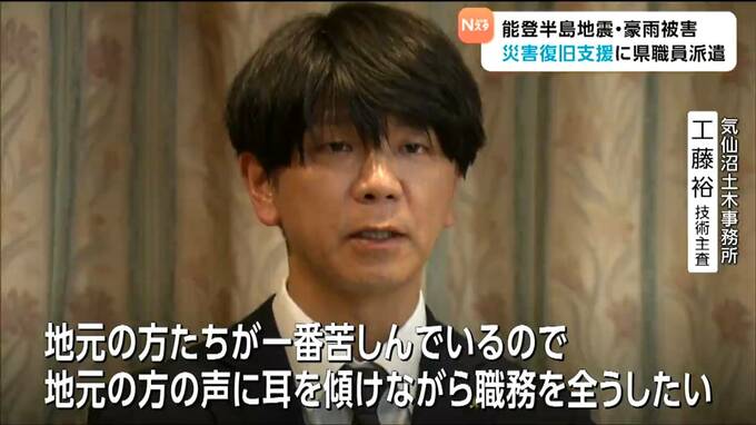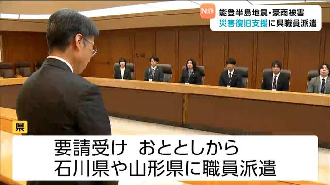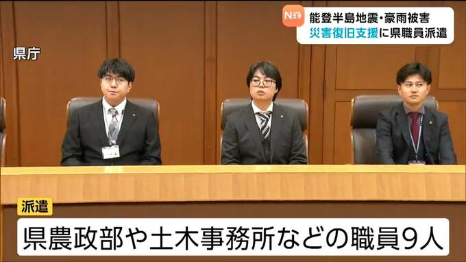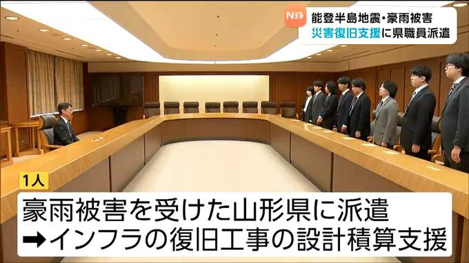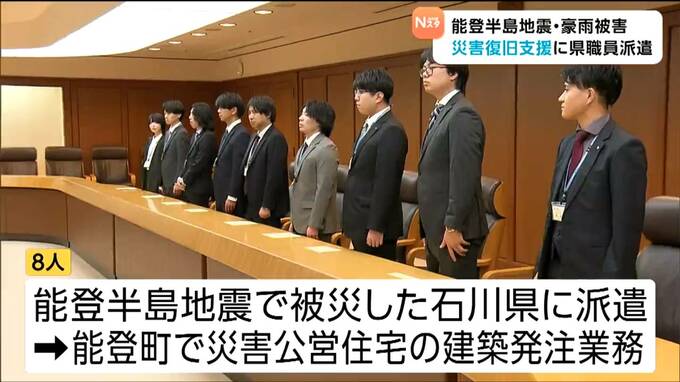このうち8人は、2024年1月に能登半島地震で被災した石川県に派遣され能登町での災害公営住宅の建築発注などをします。また、もう1人は2024年7月、豪雨被害を受けた山形県に派遣され、インフラの復旧工事の設計積算などを支援します。