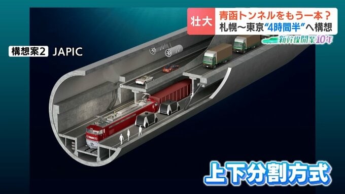 2つ目は、第二青函トンネルの中を上下に分割し、上を自動車、下を貨物列車が走るというものです。