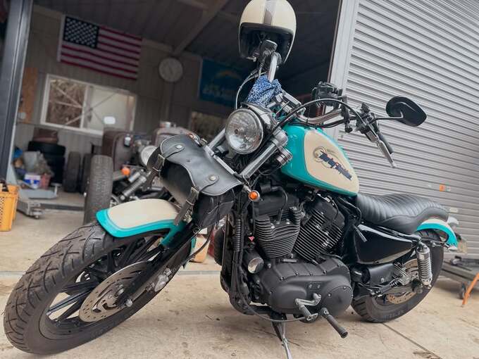 ヒロシさんのハーレーは、タンクと前後のマッドガードに「エッジはターコイズ・中はアイボリー」という鮮やかな配色でペイントされています。そしてフロントフォークにはレザーのツールバッグが取り付けられていて、ポップさと精悍さを両立させているオリジナルな仕上がりです。