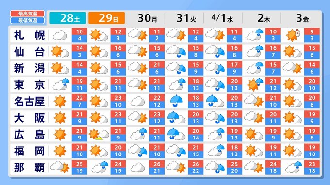 気温が平年より高くなるため、雪の多い地域では雪解けによるなだれや融雪に注意してください。あす28日以降、最高気温が20℃を超える所も多くなる見込みです。
