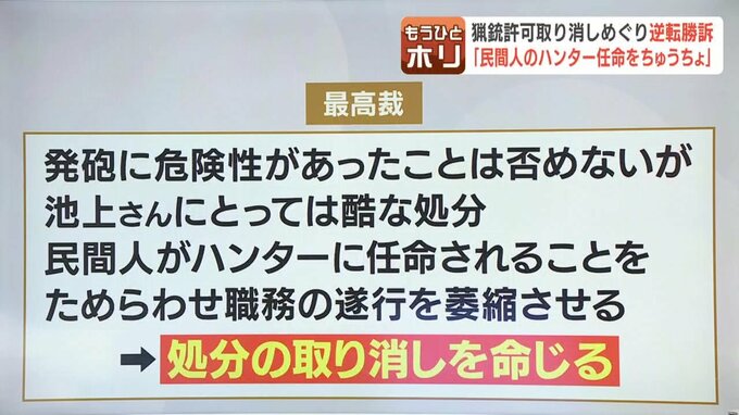 最高裁は「発砲に危険性があったことは否めない」とした一方、「池上さんにとっては酷な処分。民間人がハンターに任命されることを躊躇させ、職務の遂行を萎縮させる」などと指摘。