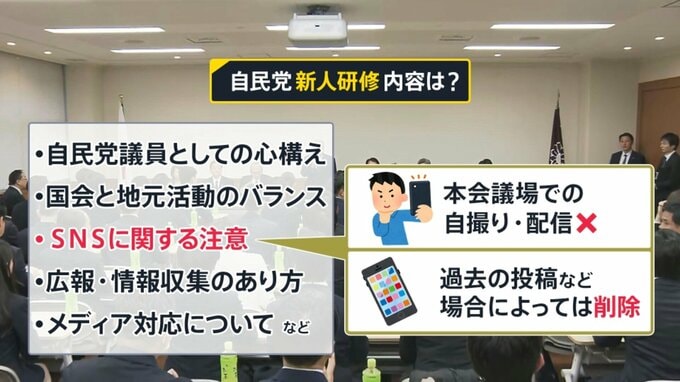 一方、党全体としての教育も行われている。2月に開かれた新人研修会では、鈴木俊一幹事長、齋藤健・中央政治大学院学院長代行、萩生田光一幹事長代行らが講師として参加。内容は「自民党議員としての心構え」「SNSに関する注意」「メディア対応」など多岐にわたった。
