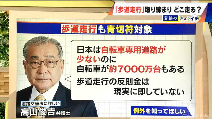 道路交通法に詳しい高山俊吉弁護士からは、「日本は自動車専用道路が少ないのに、自転車が約7000万台もある。歩道走行の反則金は現実に即していない」との意見も。