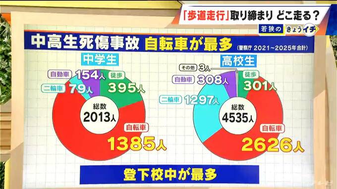 警察庁によると、中高校生の死傷事故は徒歩や家族と一緒に車に乗っていたりする時よりも、圧倒的に自転車が多くなっています。しかも、登下校中が最多で、さらに細かく見ていくと、中学生も高校生も1年生が一番多いということです。