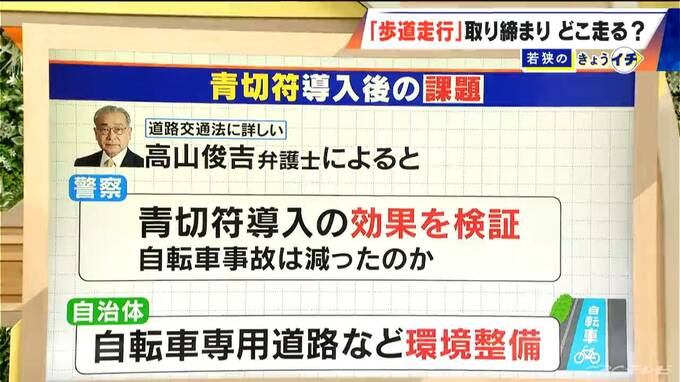 青切符導入後の課題について、高山弁護士は「警察には自転車事故が減ったのかなど、青切符導入の効果をしっかり検証してほしい。そして、自治体には自転車専用道路など環境整備を進めてほしい」と話しています。