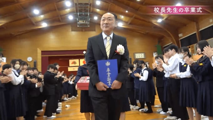 卒業証書を手に退場する岩脇校長の周囲では、生徒たちが拍手を送り続けた。37年という歳月が、凝縮された瞬間だった。