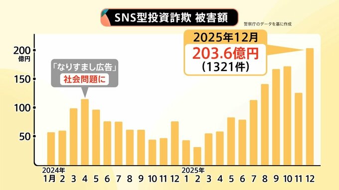 2024年に「なりすまし広告」が社会問題となった後も続いていて、2025年12月には、被害額が203.6億円(被害件数1321件)に上っています。