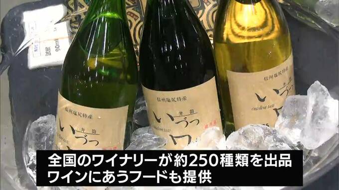 会場には、各地のワイナリーが手がけた約250種類がならび、チーズやキャビアなどワインに合うフードも提供されています。