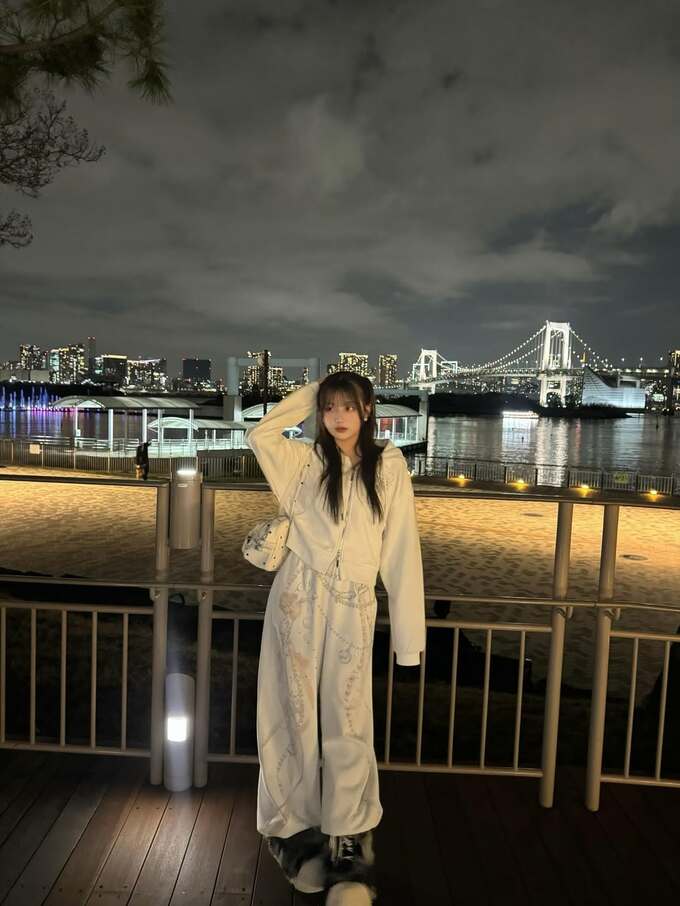 希空さんは水辺に佇み、ライトアップされたレインボーブリッジをバックに撮影した画像を投稿。白いスウェットのパーカーにスウェットパンツ、白のショルダーバッグというオールホワイトのコーディネートで、右手を頭や額に当てて、落ち着いた表情が印象的です。