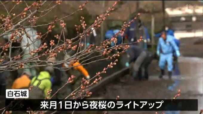 白石城では4月1日から幻想的な夜桜のライトアップを楽しむことができます。