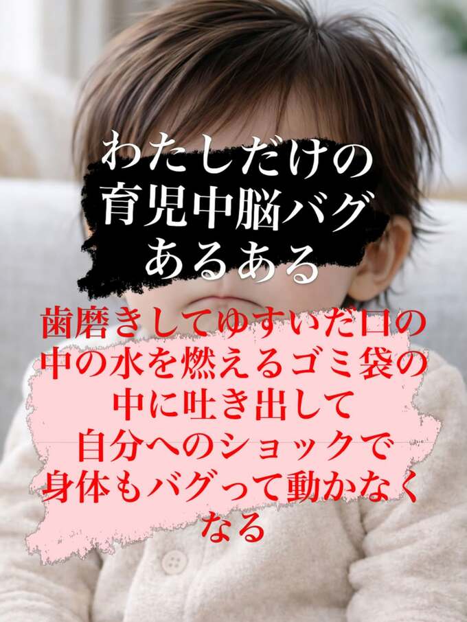 真木さんは、赤ちゃんの写真を下敷きにして「わたしだけの育児中脳バグあるある」と大書。「歯磨きしてゆすいだ口の中の水を」「燃えるゴミ袋の中に吐き出し」と、うっかり思いもよらぬ行動を取ってしまったことを明かしました。