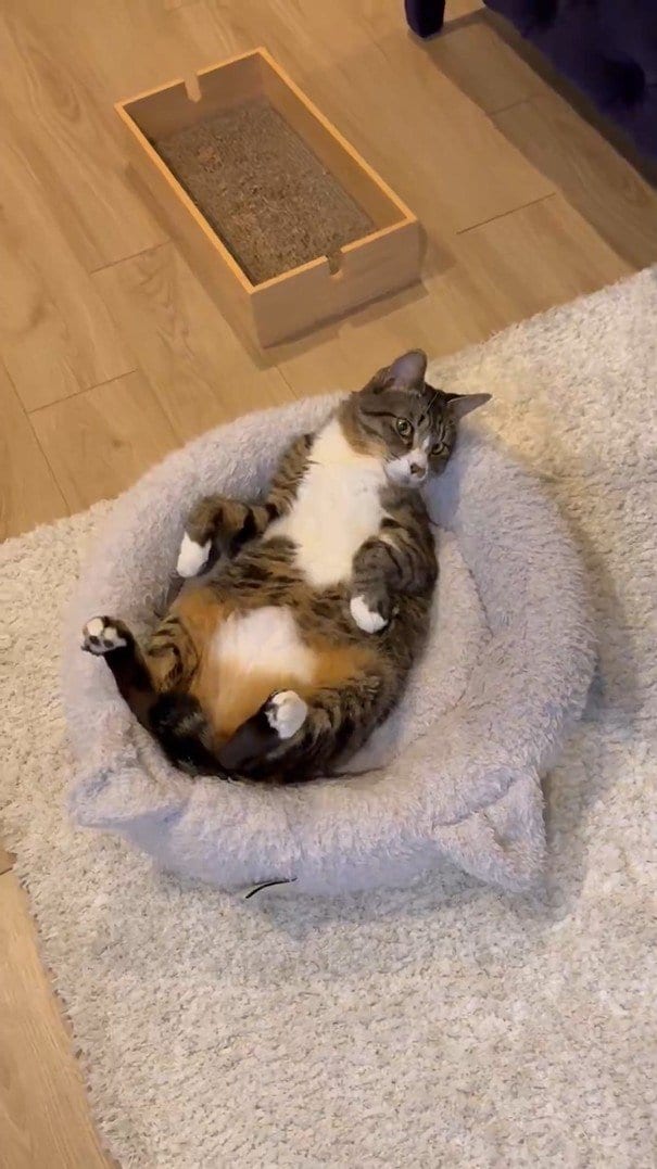 じゃこ天は、リビングのカーペットの上に置かれた、猫の顔の形をしたベッドで寛いでいます。