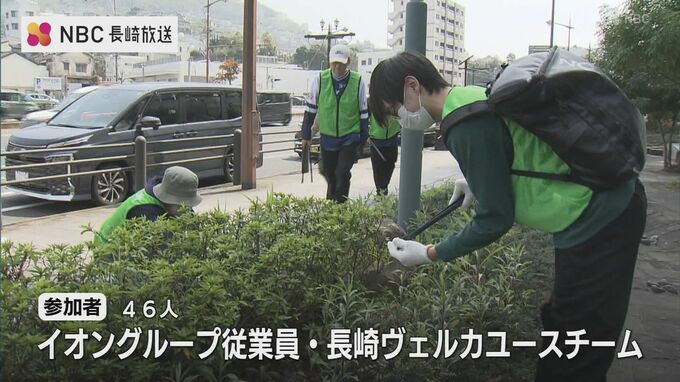 イオングループの従業員と長崎ヴェルカユースチームの選手あわせて46人が、植え込みの中や溝など、隅々までごみを拾いました。