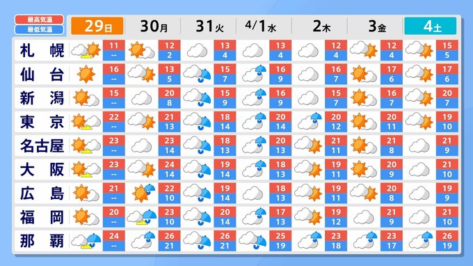 気象庁によりますと、きょう29日は、本州付近は高気圧に覆われて広く晴れる見込みで、気温は20℃を超え初夏のような陽気となるところがありそうです。ただ、太平洋側では所々でにわか雨や雷雨となる所がある見込みです。