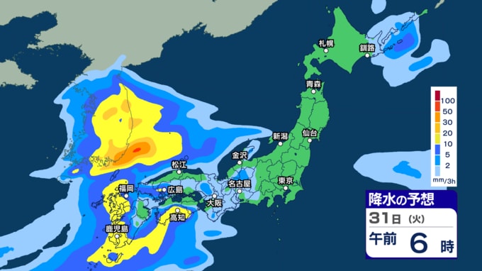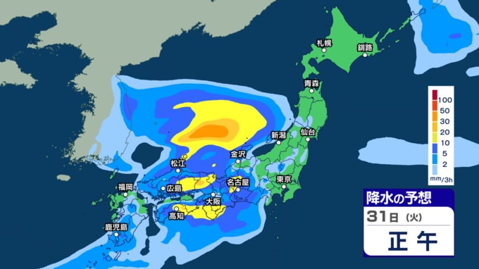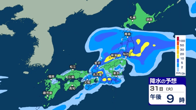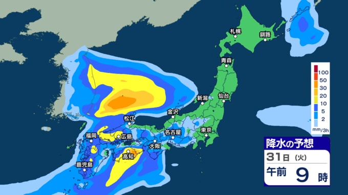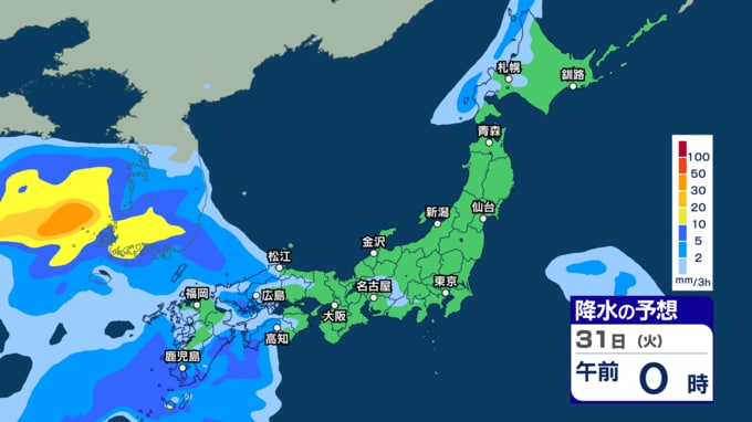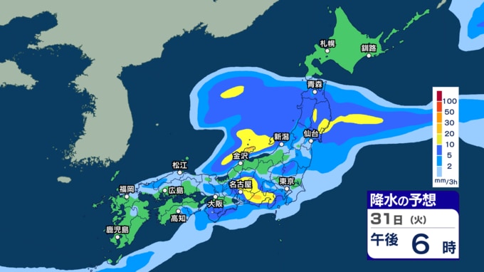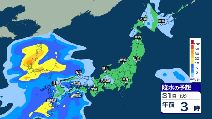 きょう29日は沖縄 あす30日から31日は西~東日本で激しい雨の恐れ 今週は雨強まり「警報級大雨」となる恐れも【29日~4月3日午後3時の雨シミュレーション・29日午前11時更新】 新潟放送 2026年3月29日(日) 11:00 31日(火)の雨のシミュレーション(3時間ごと)