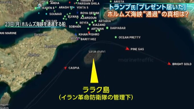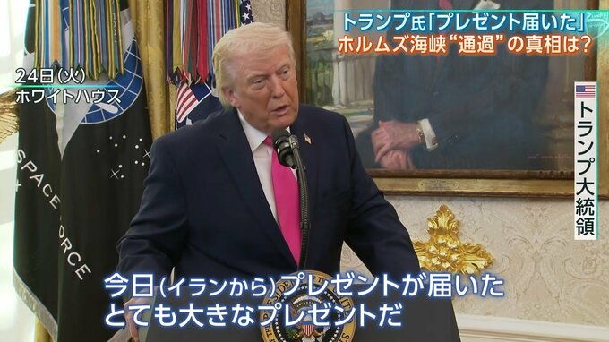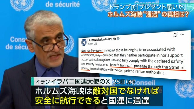 「(ホルムズ海峡を)何隻か通っていったのは事実だが、それが(トランプ大統領への)プレゼントかというとあまり信用が置けない。むしろイラン革命防衛隊の方が自分で宣言して“安全回廊”を作った」