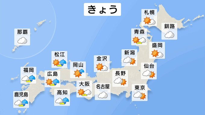 きょうは低気圧や前線の影響で、西日本を中心に雨雲が広がります。夜は雷を伴って激しく降る所もあるでしょう。東海や関東も雲が広がりやすく、にわか雨の可能性があります。気温は高く、西日本や東日本では25℃近…