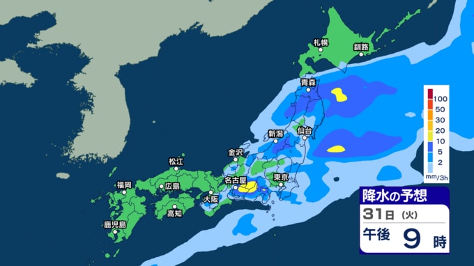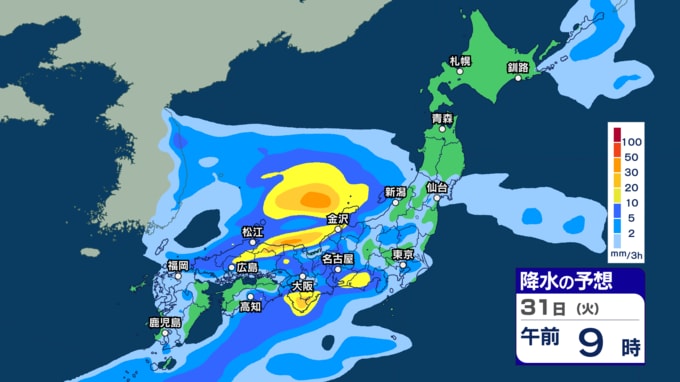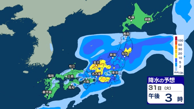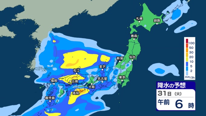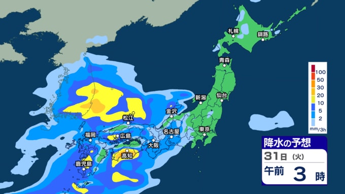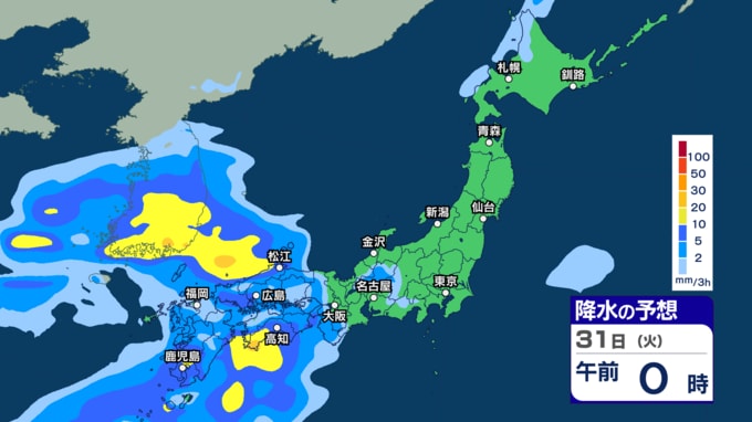 九州南部では雷伴う非常に激しい雨が降る恐れも 西日本で急な強い雨などに注意 雨の範囲は次第に東へ【30日~4月4日午後3時の雨シミュレーション・30日正午更新】 新潟放送 2026年3月30日(月) 12:00 31日(火)の雨のシミュレーション(3時間ごと)