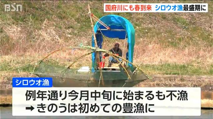 国府川のシロウオ漁は例年通り今月中旬に始まりましたが、なかなか網に入らず、先週末からようやく取れ始めました。