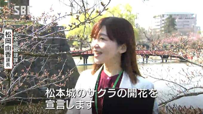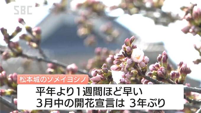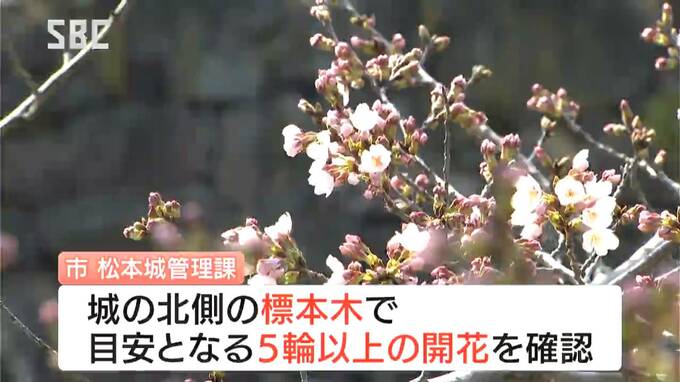 市の松本城管理課の職員が、城の北側にある標本木で開花の目安となる5輪以上が咲いていることを確認。去年より2日、平年より1週間ほど早い開花で、3月中の開花宣言は3年ぶりです。