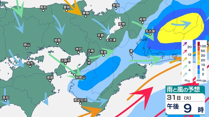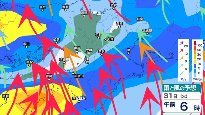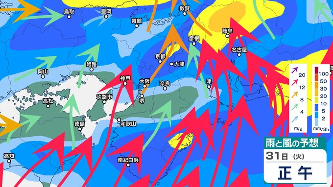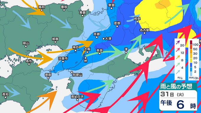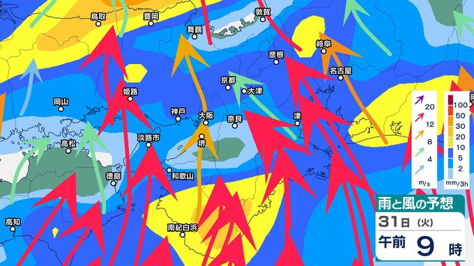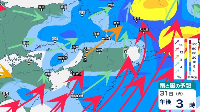 前線や低気圧に向かって暖かく湿った空気が流れ込むため、近畿地方では、31日朝から夜のはじめ頃にかけて、大気の状態が非常に不安定となり、局地的に雷雲が発達するということです。
