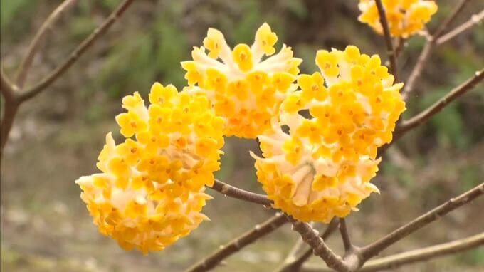 兵庫県丹波市ではミツマタの花が見頃を迎えています。 枝先に小さな花がいくつも集まって咲いているミツマタ。 丹波市の大名草地区にはミツマタの群生地があり、この時期、山の斜面を黄色く彩っています。 …