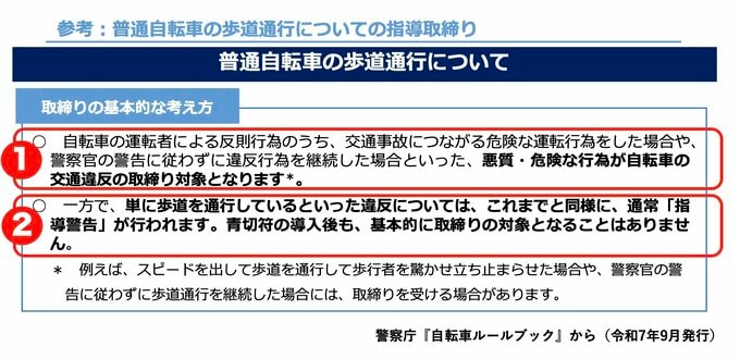 上記「取り締まりの基本的な考え方」を見てのとおり(1)で悪質・危険な行為が自転車の交通違反の取締り対象となりますとした上で、(2)単に歩道を通行しているといった違反については(中略)青切符の導入後も、基本的に取締りの対象となることはありませんと、明確に方針を示しています。