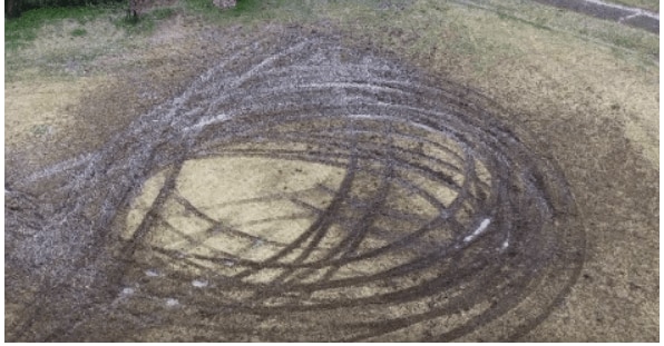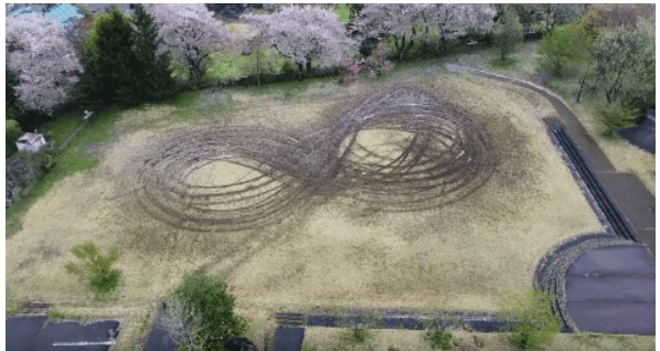 当時撮影されたドローンによる公園の写真では、芝の地面が大きく8の字を描くようにえぐれているのがわかります。※町提供