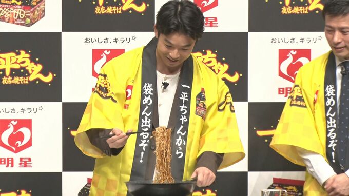 この日は実際に袋めんの調理も実施。ソースを絡める場面では〝これこれこれ!きた~。いい香り〟と鼻腔を広げて興奮気味に語り、試食シーンではマスコミ向けのフォトタイムでおあずけを食らうと、〝早く食べさせてくださいよ~〟と身もだえしながら堪えていました。