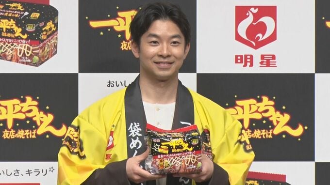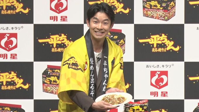 俳優の仲野太賀さんがブランドキャラクターを務める「明星 一平ちゃん夜店の焼そば 袋めん」新商品発表会に焼きそばのソースカラーをイメージした茶色のスーツ姿で登場しました。