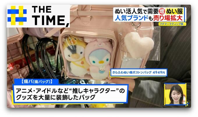 さらに、「ぬいぐるみを入れる用の“痛バ”(痛バッグ:アニメ・アイドルなど推しキャラクターのグッズを大量に装飾したバッグ)もかなり人気」(男澤店長)とのことで、洋服とセットで買っていく人も多いといいます。