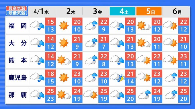 九州北部地方(山口県を含む) 4月5日頃から かなりの高温